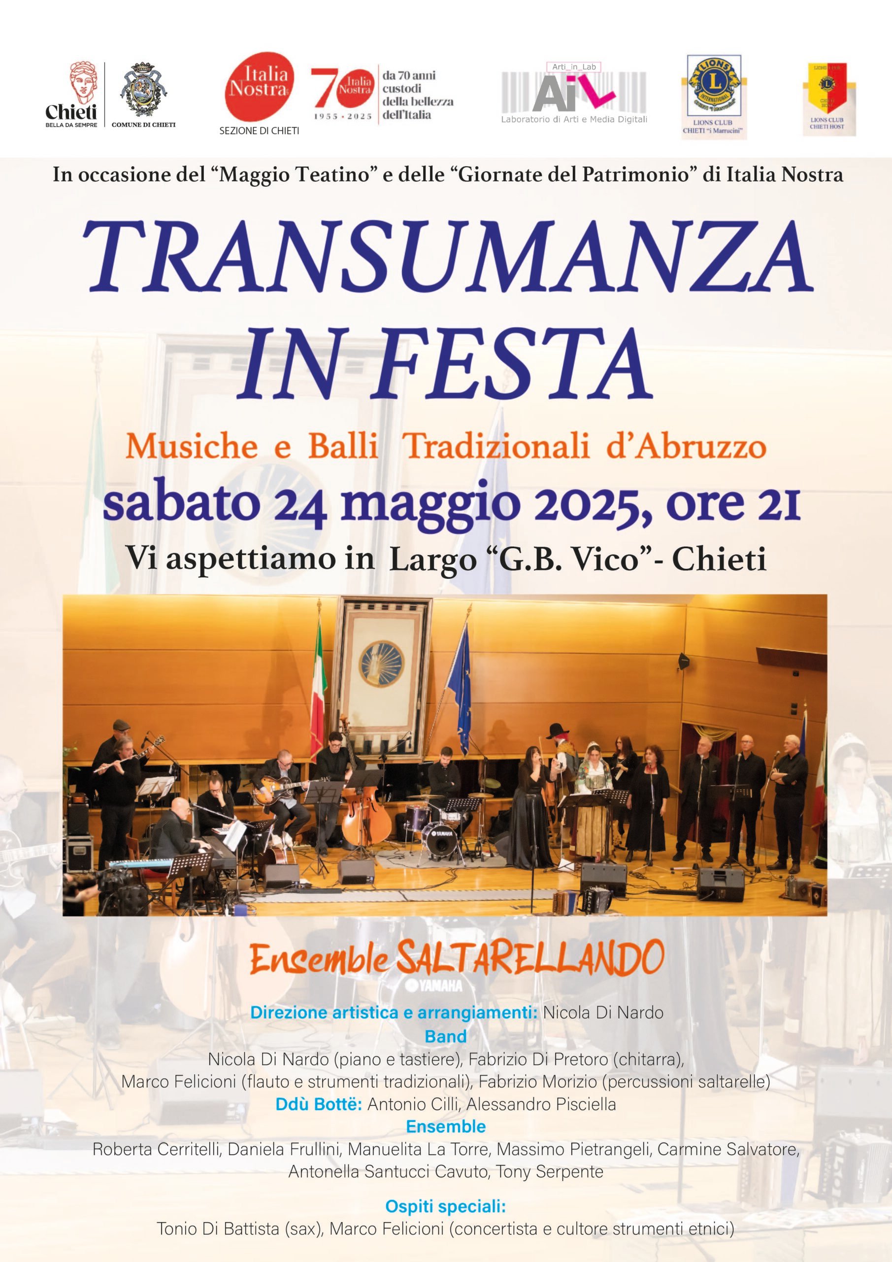 Sabato 24 maggio, alle ore 21, a Chieti, in Largo G.B. Vico, nell’ambito del “Maggio Teatino” ed a conclusione delle “Giornate del Patrimonio” di Italia Nostra, si terrà un concerto vocale e strumentale, con musiche e balli della tradizione popolare abruzzese.