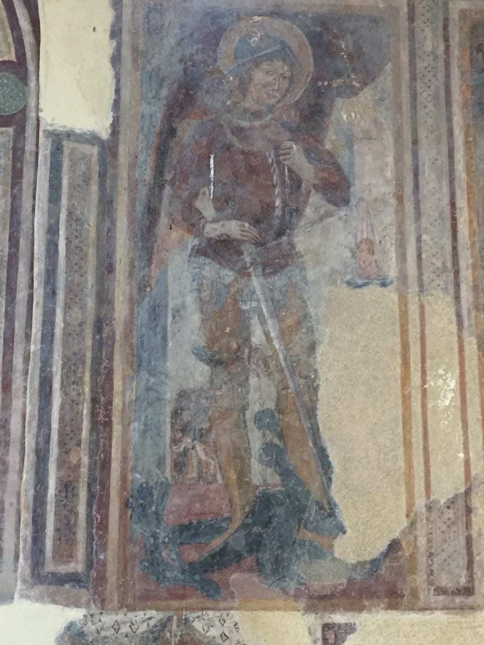 Pieno di fascino, questo interno è la cornice di un ulteriore motivo di attrazione dell’antica plebana. Esso consiste in un affresco che, sebbene pervenutoci fortemente ridotto rispetto alla sua estensione originaria, conserva una qualche leggibilità. Vi si riconoscono, in particolare, disposti in successione paratattica, preceduti da una Crocifissione con i Dolenti, tre riquadri nei quali campeggiano altrettante figure di campioni della fede: l’arcangelo Michele, in elmo e corazza, la spada sguainata; un santo vescovo che non sembra offrire elementi iconografici peculiari e S. Sebastiano.