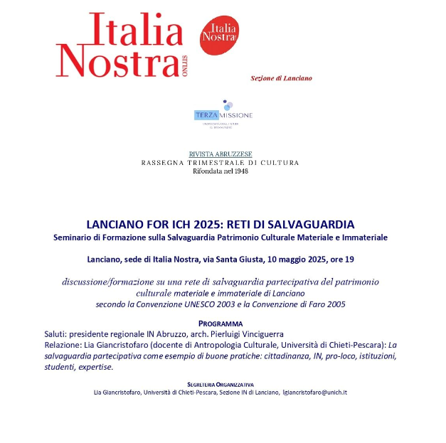 Il 10 maggio 2025 la sezione di Italia Nostra di Lanciano condividerà i risultati della propria azione in un evento seminabile organizzato presso la sede della sezione, in via Santa Giusta.