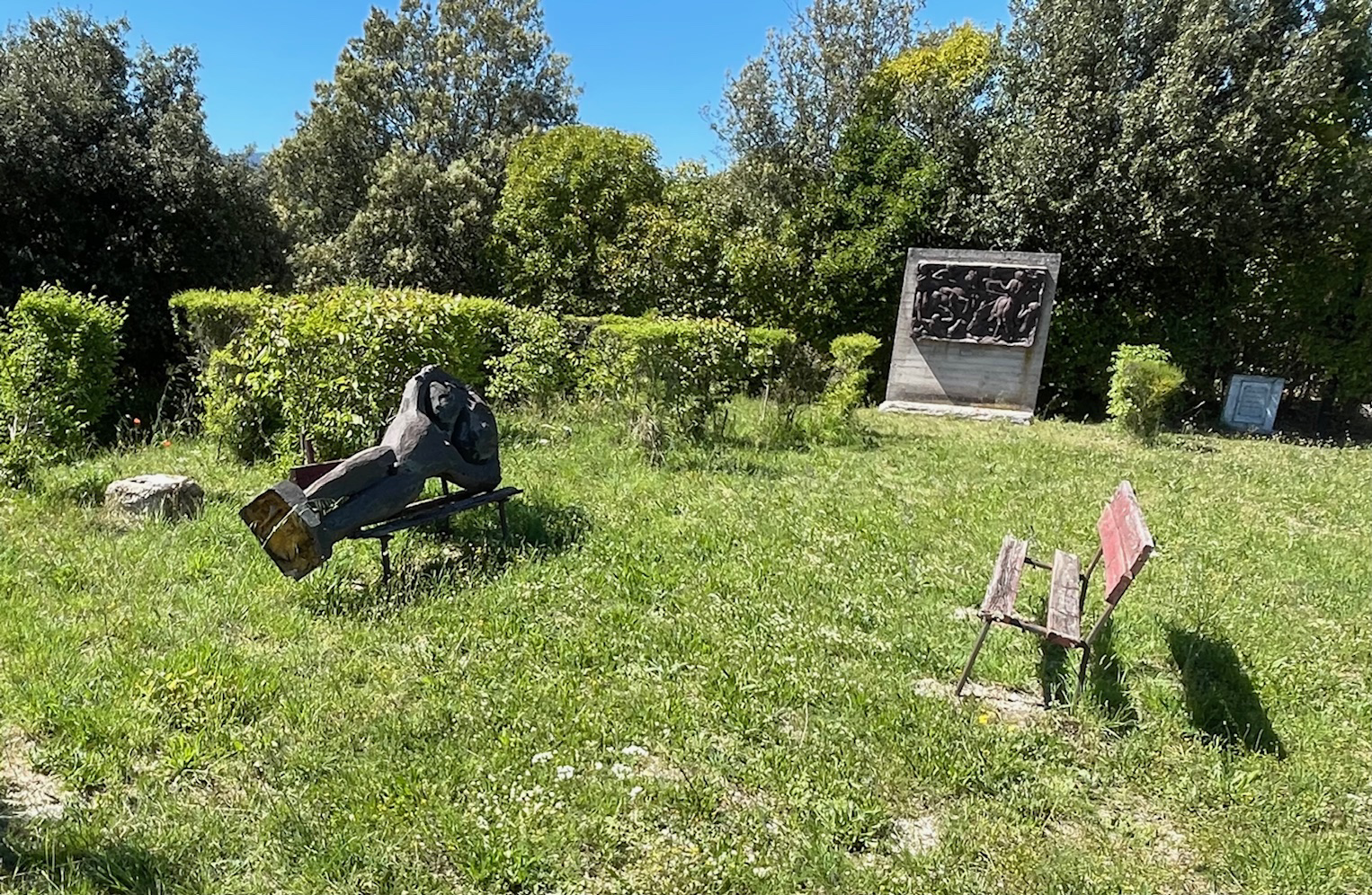 Potremmo intitolarla “IRONIA DEL DEGRADO” oppure “FINESTRA ROTTA SPOSTATI”: è l’involontaria opera seconda di Aurelio De Felice (1915-1996). Questi credeva che le riproduzioni delle proprie sculture dovessero ovviamente essere in piedi e non certo finire a terra o su una panchina. E immaginò di collocarle nel parco-museo di Torre Orsina, Terni, proprio accanto alla sua magione di un tempo.